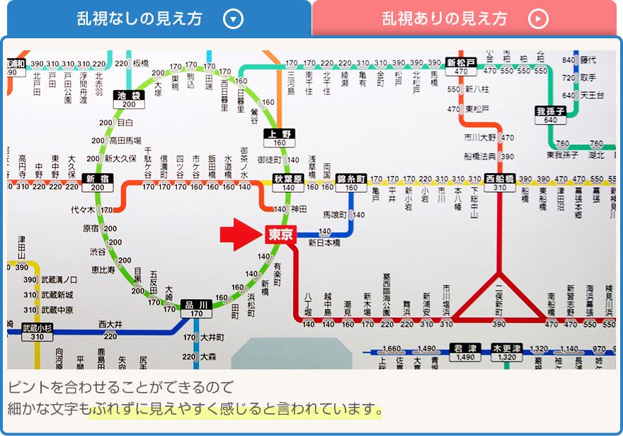 近視や遠視は、見るものまでの距離によって見え方が変わります。 乱視は距離にかかわらず、ぼけて見えます。