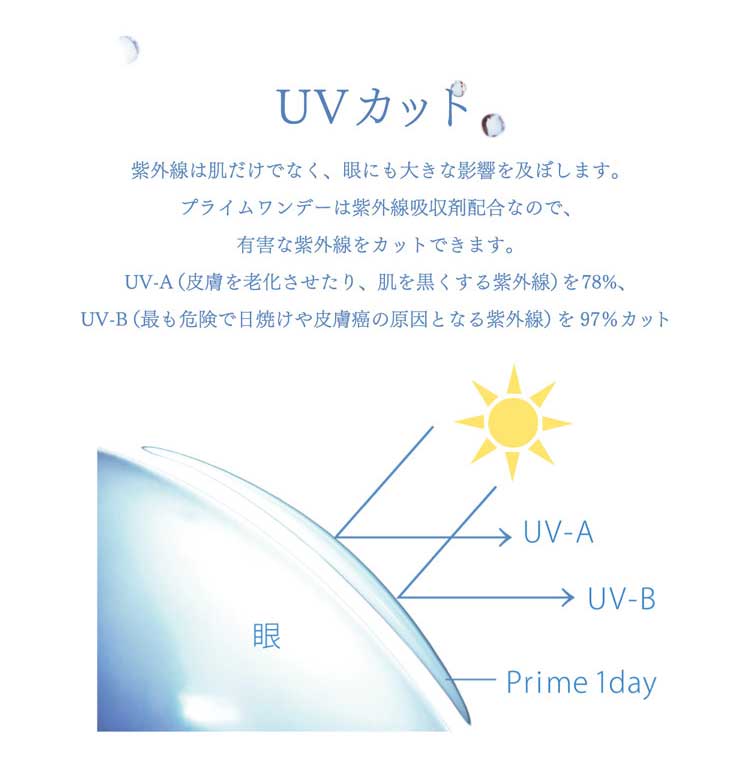 プライムワンデーは、従来品の2倍以上の保水力があるので、1日中快適。その秘密はうるおい成分「MPCポリマー」。MPCポリマーが潤いのヴェールとなってレンズをやさしく包み込むため、瞳にもやさしく、涙のうるおいが長くつづきます。眼の乾きによるゴロゴロした違和感を感じることなく、1日中快適にご使用いただけます。